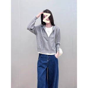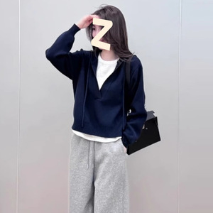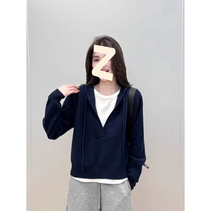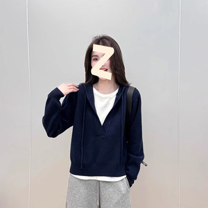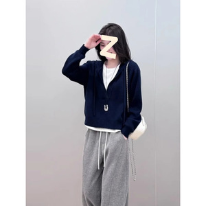 韩系时尚高级感连帽长袖针织衫女春季气质减龄撞色拼接假两件上衣