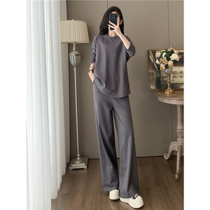 深圳南油针织套装女秋季时尚宽松慵懒风简约圆领毛衣阔腿裤两件套