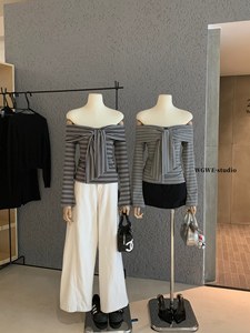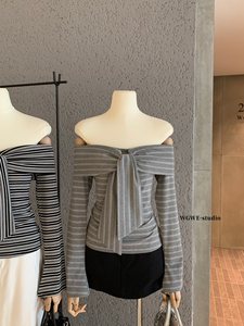 WGWE6968广州十三行女装2025秋装新款扭结一字肩修身显瘦长袖T恤