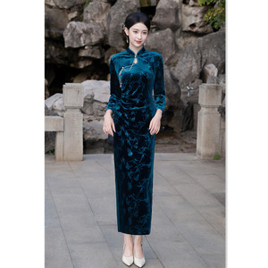 丝绒压花蓝旗袍2025秋季新款时尚改良新中式年轻女士日常可穿旗袍