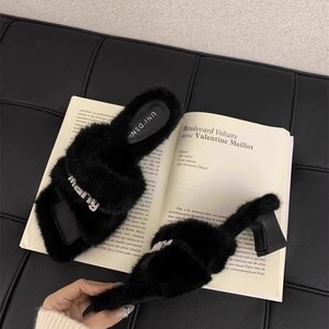 欧美风羊羔毛外穿拖鞋女2025秋季方头中跟露趾毛毛鞋粗跟高跟凉拖