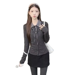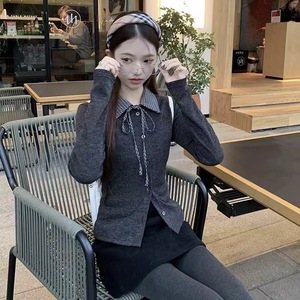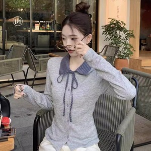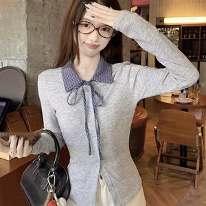韩系复古格子polo领系带针织衫女春秋新款学院风修身内搭长袖上衣