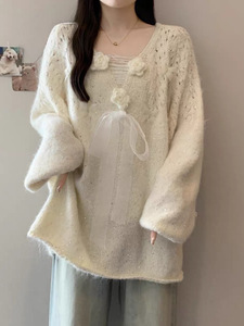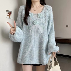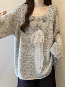 立体花朵亮片V领针织衫毛衣女款春秋2025大码胖mm法式蝴蝶结上衣