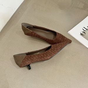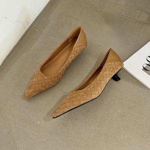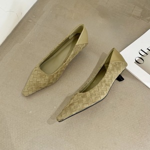 编织气质尖头猫跟单鞋女2025秋季新款通勤尖头编织小跟猫跟单鞋女