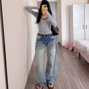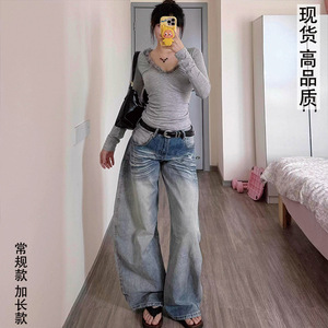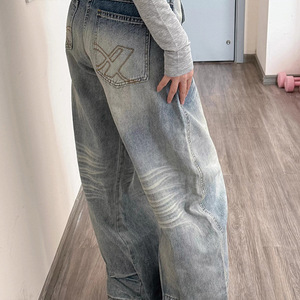 做旧弯刀牛仔裤男夏季美式高街廓形复古宽松设计感水洗猫须阔腿裤