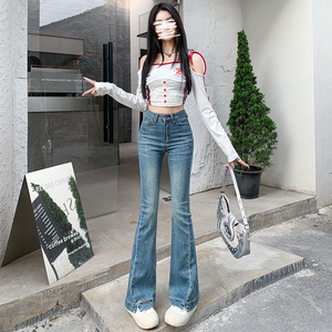 浅蓝色小开叉微喇牛仔裤女2025秋季新款弹力修身显瘦高腰喇叭裤子