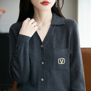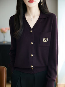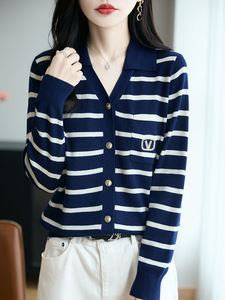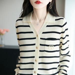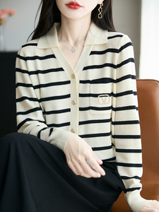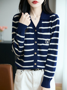 2025早秋新款V领条纹针织衫长袖T恤女装时尚外搭针织开衫外套