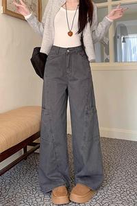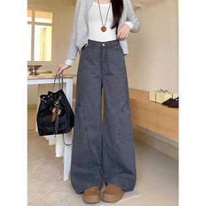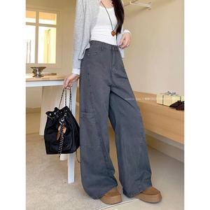 美式复古灰色工装阔腿牛仔裤女秋季新款高腰宽松直筒休闲拖地裤子