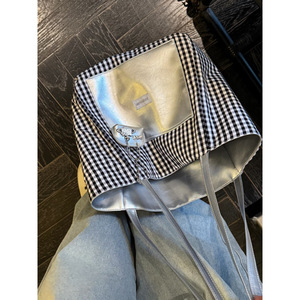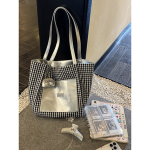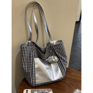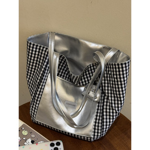 韩系高级感双面背银色托特包女2025新款黑白格子大容量通勤电脑包