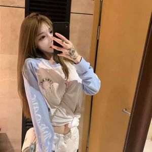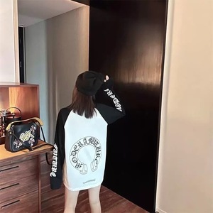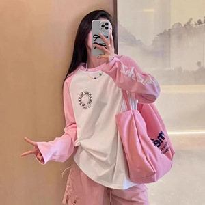 2025早秋新款十字架梵文印花美式复古撞色插肩网红同款长袖T恤女
