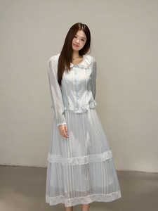 秋季新款复古刺绣娃娃领条纹蕾丝裙两件套大码女装拼接套装65466