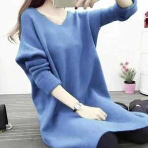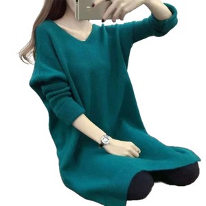 慵懒风v领中长款毛衣女秋冬圆领纯色宽松百搭洋气韩版外穿连衣裙