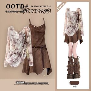 春季套装女2025新款时尚百搭洋气长袖上衣搭显瘦吊带连衣裙两件套