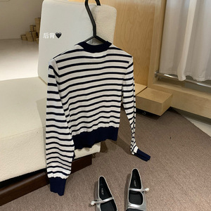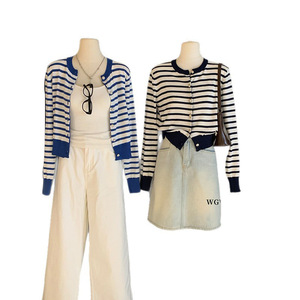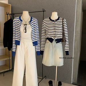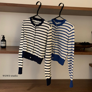 WGWE7177撞色条纹圆领长袖针织衫女韩系慵懒风宽松显瘦开衫上衣