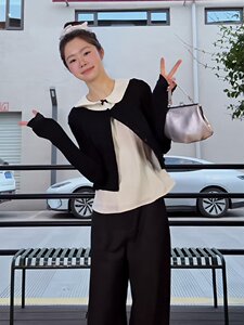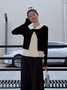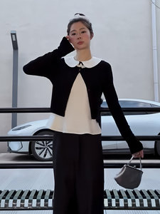 套装女秋季法式复古蝴蝶结白色娃娃领无袖背心上衣黑色长袖开衫潮