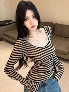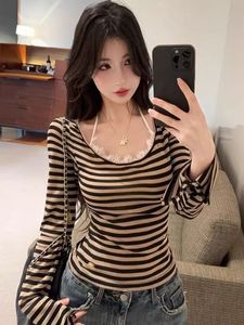 假两件条纹长袖t恤女秋冬纯欲辣妹挂脖上衣巨好看蕾丝打底衫内搭