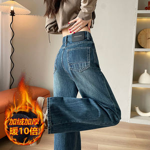 阔腿牛仔裤女2025年秋冬新款高腰显瘦宽松拖地加绒窄版直筒裤子