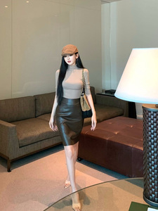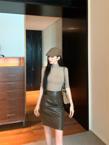 女装高级感气质半袖T恤修身显瘦半高领上衣半身裙皮裙两件套秋装