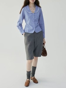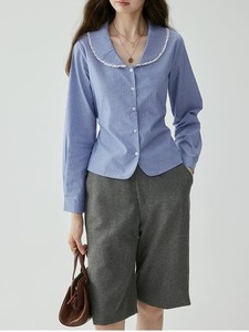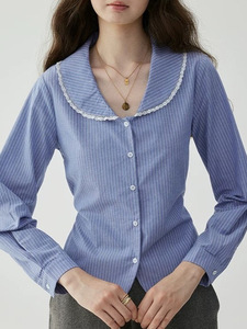 「芥末派VOOE」收腰花边彼得潘领条纹衬衫女秋季新款显瘦气质上衣