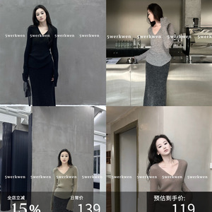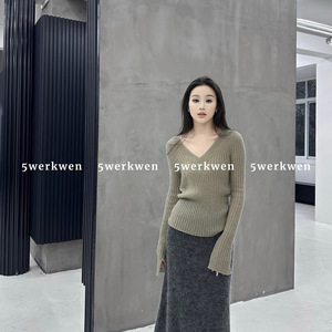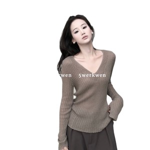 5werkwen 纸片人慵懒开衩袖针织打底衫女春夏百搭V领显瘦长袖上衣