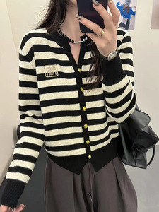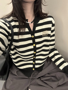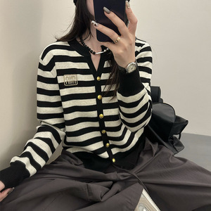 刺绣条纹针织开衫女2025春秋新款时尚宽松外搭毛衣外套小香风上衣