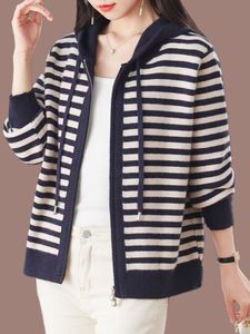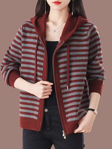 时尚女春秋季宽松大码连帽妈妈条纹毛衣外套时尚网红爆款针织开衫