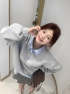 韩系学院风假两件polo领卫衣女春秋设计感宽松慵懒风套头休闲上衣
