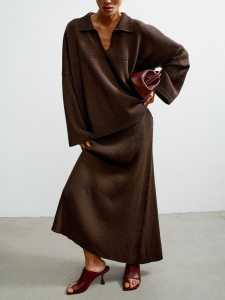 跨境热卖棕色镂空针织毛衣女翻领蝙蝠袖上衣高腰半身裙秋冬慵懒风