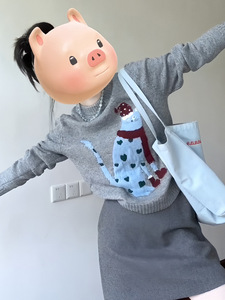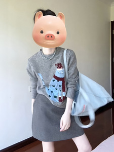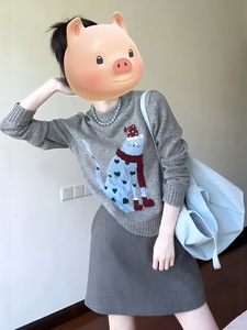 圆领套头针织毛衣女秋冬季慵懒卡通提花内搭软糯短款2025新款上衣