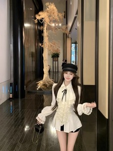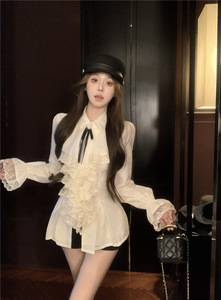 千金风法式蕾丝荷叶边长袖衬衫女2025秋季新款显瘦米杏色上衣