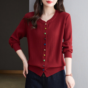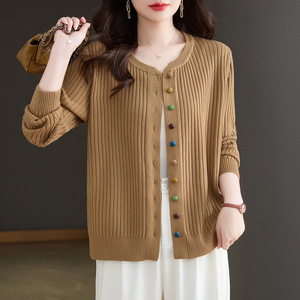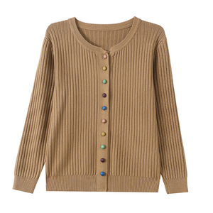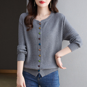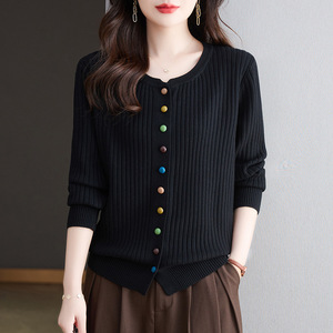 春秋圆领彩扣开衫女针织上衣2025秋新款毛衣外套百搭洋气外搭女