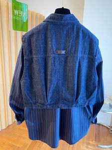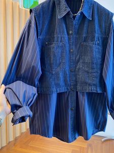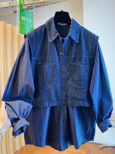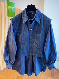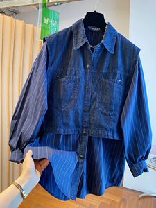ins高级感牛仔拼接条纹衬衫秋季宽松大码300斤胖MM独特假两件上衣