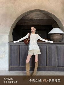 鹭青一原创【沛茗】法式镂空针织白色长袖T恤女秋慵懒风修身上衣