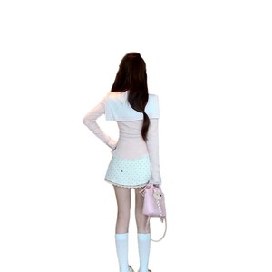 早秋韩系纯欲甜美风穿搭海军领收腰显瘦粉色上衣波点包臀裙两件套