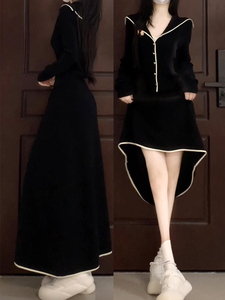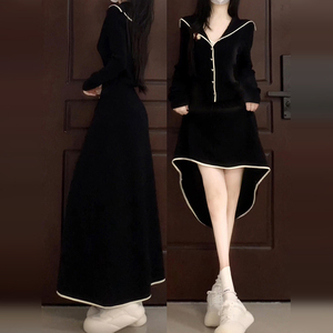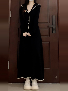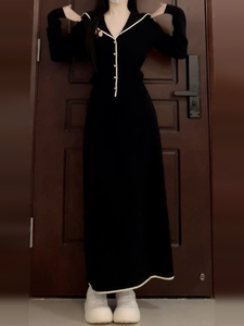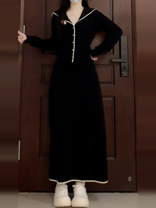 法式学院风海军领黑色针织连衣裙子女秋冬2025新款高级感套装长裙