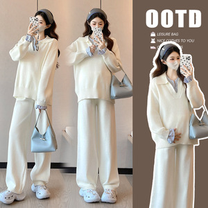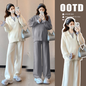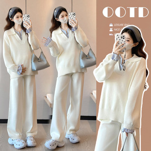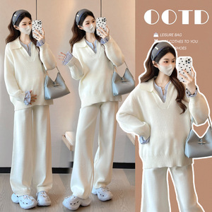 孕妇韩版宽松休闲拼接翻领孕妇毛衣+潮妈阔腿针织裤甜美显瘦套装