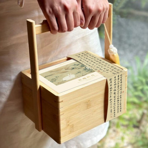 小竹木提篮空盒+明月山涧盖衬纸+书法装饰封条+流苏一个