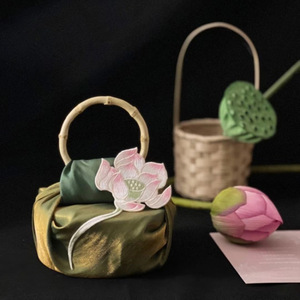 空圆木皮盒款+金绿色幻彩仿布+荷花刺绣装饰+手提环一个