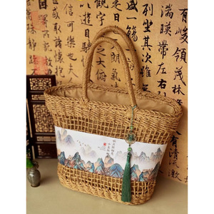 大竹木提篮空盒+明月山涧盖衬纸+书法装饰封条+流苏一个