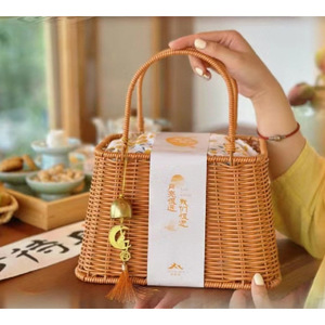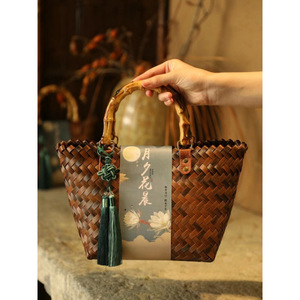 大竹木提篮空盒+花庭秋月盖衬纸+书法装饰封条+流苏一个