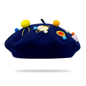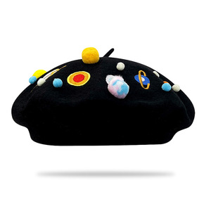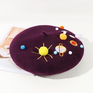 秋冬新款宇宙星球贝雷帽外贸跨境专供款刺绣羊毛呢画家帽保暖百搭