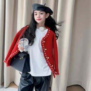 女童小香风毛衣外套2025秋季新款小女孩时髦打底衫百搭皮裤三件套