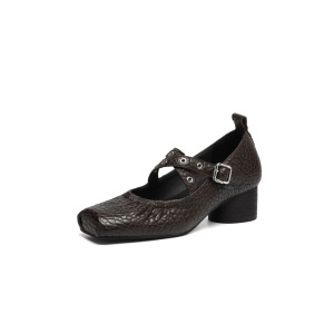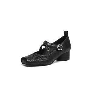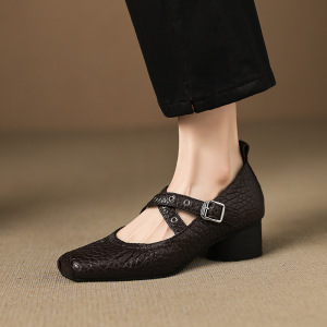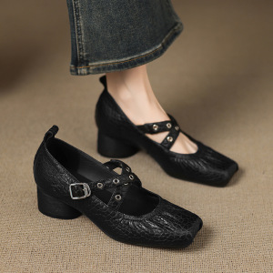 时尚荔枝纹羊皮方头玛丽珍鞋新品交叉扣带粗中跟褶皱真皮软面单鞋