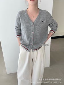 琪镌绘制秋季新款V领撞色胸前刺绣长袖针织T恤上衣百搭显瘦516355