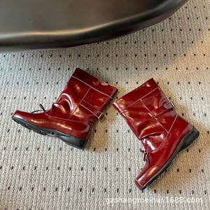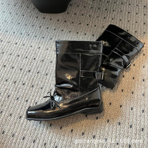 高定小众秋冬款OPEN方头蝴蝶结油蜡皮短靴女复古猪鼻子皮带扣女靴