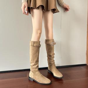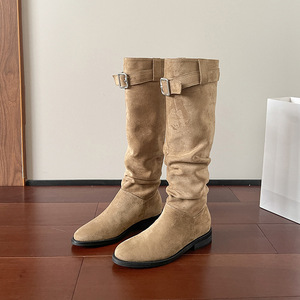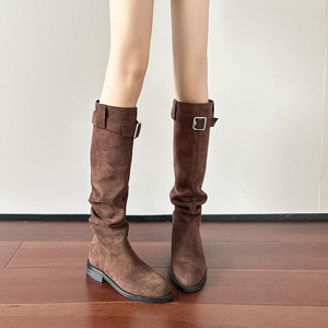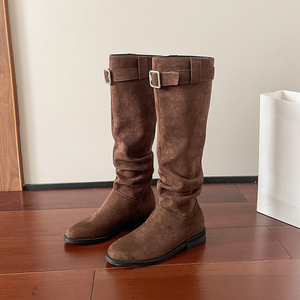 2025秋冬季新款美拉德风靴子女低跟高筒靴褶皱绒面堆堆靴加绒长靴