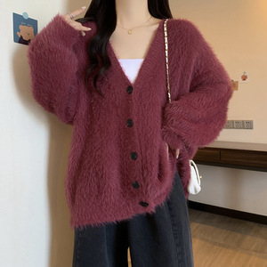 秋冬水貂绒慵懒风新款大码保暖针织开衫毛衣女生休闲名媛街拍外套