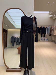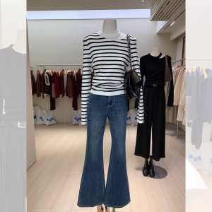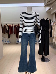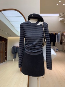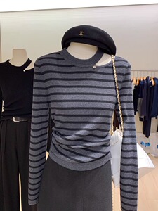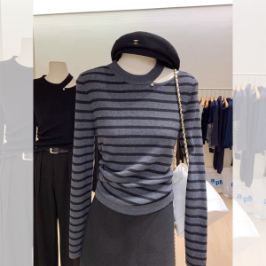 韩版慵懒风灰色条纹针织衫春秋新款宽松显瘦镂空高级感打底上衣女