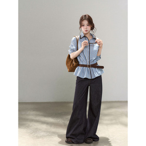 一颗小野莓蓝条纹防晒长袖衬衫女秋季新款宽松百搭高级感chic衬衣
