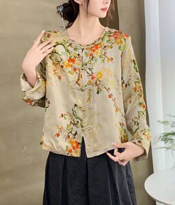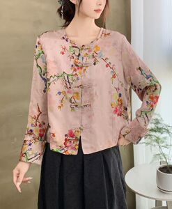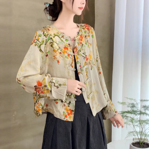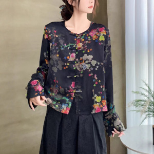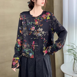 秋季新款2025 新中式圆领提花衬衫 民族风盘扣人丝棉印花长袖外套